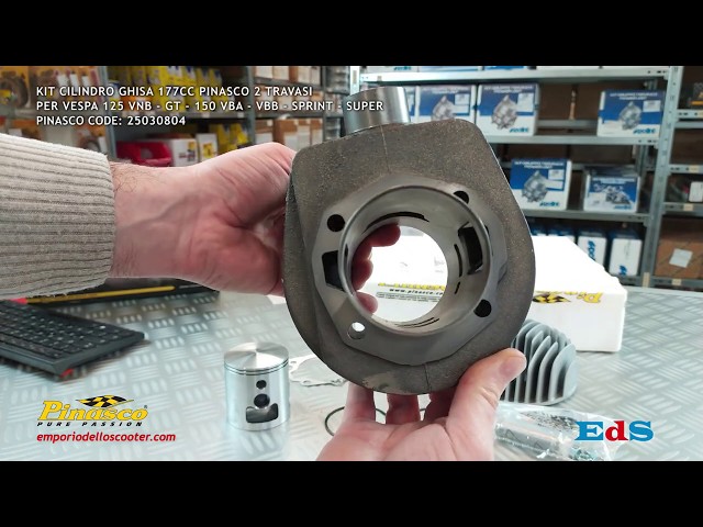 Questo cilindro Pinasco in ghisa con pistone da 63mm di diametro con una cilindrata di 177cc è intercambiabile a quello originale montato su Vespa 125 VNB – 125 SUPER – 125 GT – 125 GTR – 150 SUPER - 150 VBA - 150 VBB - 150 SPRINT – 150 GL – (Vespe con carter motore a due travasi, cosa vuol dire? Prendete il cilindro e guardatelo nel lato che va sul carter, in questo punto sul collo del cilindro, dovresti vedere 2 fori ai lati). Pronto al montaggio, questo kit non necessita di particolari conoscenze tecniche per essere installato e si adatta facilmente a tutte le Vespe senza bisogno di lavorazioni specifiche. Si possono esaltare ancor di più le prestazioni di questo kit cilindro sostituendo l'albero motore originale (che può andare bene) con uno anticipato o con uno a corsa lunga. Le caratteristiche tecniche di questo cilindro sono una notevole coppia e consumi ridotti. Ulteriori modifiche che si possono fare alla Vespa con questo kit cilindro sono la sostituzione del carburatore, dell'accensione elettronica ad anticipo variabile, la campana per allungare le marce, la frizione rinforzata e la marmitta. Il kit viene fornito con testa e guarnizioni necessarie al montaggio. Le lavorazioni che i tecnici Pinasco hanno fatto a questo cilindro si possono riassumere in una robustezza eccezionale garantendo prestazioni superiori in tutti i regimi di utilizzo. Per qualunque informazione non esitare a contattare il servizio clienti di Emporio dello Scooter che sarà felice di trovare la configurazione ideale per il tuo utilizzo. Alcuni articoli sono destinati all'uso agonistico-sportivo, quindi l'utilizzo su pista e non su strade aperte al pubblico, vi consigliamo di controllare la carta di circolazione del veicolo.