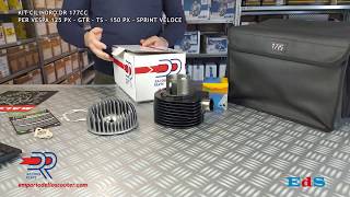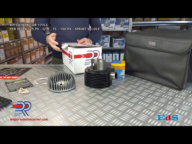 Questo cilindro DR in ghisa con pistone da 63mm di diametro con una cilindrata di 177cc è intercambiabile a quello originale montato su Vespa 125 TS - 125 GTR - PX 125 - P125X PX125E - P150X - PX150X - PX 150 - PX ARCOBALENO - 150 SPRINT VELOCE (Vespe con carter motore a tre travasi, cosa vuol dire? Prendete il cilindro e guardatelo nel lato che va sul carter, in questo punto sul collo del cilindro, dovresti vedere 2 fori ai lati e uno in corrispondenza dello scarico). Pronto al montaggio, questo kit non necessita di particolari conoscenze tecniche per essere installato e si adatta facilmente a tutte le Vespe senza bisogno di lavorazioni specifiche. Si possono esaltare ancor di più le prestazioni di questo kit cilindro sostituendo l'albero motore originale (che può andare bene) con uno anticipato o con uno a corsa lunga. Le caratteristiche tecniche di questo cilindro sono una notevole coppia e consumi ridotti. Ulteriori modifiche che si possono fare alla Vespa con questo kit cilindro sono la sostituzione del carburatore, dell'accensione elettronica ad anticipo variabile, la campana per allungare le marce, la frizione rinforzata e la marmitta. Le lavorazioni che i tecnici DR hanno fatto a questo cilindro si possono riassumere in una robustezza eccezionale garantendo prestazioni superiori in tutti i regimi di utilizzo. La differenza sostanziale con quello originale è che questo cilindro è stato rivisto nei travasi per poter avere un po' di brio in più alla Vespa, sviluppando una potenza superiore a quello originale. Il kit viene fornito con testa e guarnizioni necessarie al montaggio.