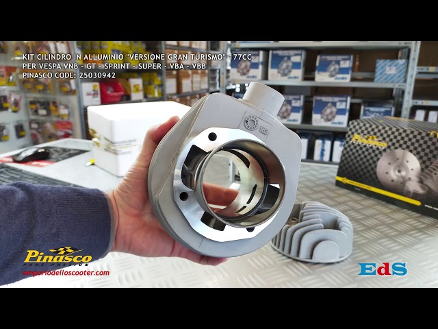 Questo cilindro Pinasco in alluminio con pistone da 63mm di diametro con una cilindrata di 177cc è intercambiabile a quello originale montato su Vespa 125 VNB – 125 SUPER – 125 GT – 125 GTR – 150 SUPER - 150 VBA - 150 VBB - 150 SPRINT – 150 GL – (Vespe con carter motore a due travasi, cosa vuol dire? Prendete il cilindro e guardatelo nel lato che va sul carter, in questo punto sul collo del cilindro, dovresti vedere 2 fori ai lati). Pronto al montaggio, questo kit non necessita di particolari conoscenze tecniche per essere installato e si adatta facilmente a tutte le Vespe senza bisogno di lavorazioni specifiche. Si possono esaltare ancor di più le prestazioni di questo kit cilindro Pinasco sostituendo l'albero motore originale (che può andare bene) con uno anticipato o con uno a corsa lunga. Le caratteristiche tecniche di questo cilindro sono una notevole coppia e consumi ridotti. Ulteriori modifiche che si possono fare alla Vespa con questo kit cilindro sono la sostituzione del carburatore, dell'accensione elettronica ad anticipo variabile, la campana per allungare le marce, la frizione rinforzata e la marmitta. Il kit viene fornito con testa e guarnizioni necessarie al montaggio. Le lavorazioni che i tecnici Pinasco hanno fatto a questo cilindro si possono riassumere in una robustezza eccezionale garantendo prestazioni superiori in tutti i regimi di utilizzo. Per qualunque informazione non esitare a contattare il servizio clienti di Emporio dello Scooter che sarà felice di trovare la configurazione ideale per il tuo utilizzo. Alcuni articoli sono destinati all'uso agonistico-sportivo, quindi l'utilizzo su pista e non su strade aperte al pubblico, vi consigliamo di controllare la carta di circolazione del veicolo.