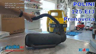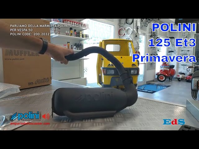 Questa marmitta POLINI ad espansione è lo scarico racing da sostituire a quello originale (siluro, padellino o pignata) per i modelli Vespa 50 N - 50 L (Lusso) - 50 Revival - 50 R (Rinnovata) Vespa 50 3 marce - 50 4 marce - 50 Special. Monta senza fare modifiche e le prestazioni migliorano a tutti i regimi di giri regalando ripresa e allungo (velocità). Negli ultimi anni molte sono le novità proposte dai vari brand che hanno segnato la storia della Vespa proponendo diverse versioni adatte a tutti i kit cilindro 75cc 80cc 85cc 90cc 100cc 102cc 112cc 115cc. Il prezzo di vendita varia dalla lavorazione, infatti alcune marmitte sono formate da due gusci stampati e saldati fra loro, altre hanno un insieme di coni e controconi (queste sono quelle con una linea più sportiva). Queste differenze di lavorazione modificano il costo della marmitta. Alcune marmitte montano un silenziatore esterno, rigenerabile con lana di vetro e modificabile, mentre altri hanno il silenziatore posizionato all'interno della pancia dello scarico. Si possono trovare modelli con DGM e omologazione stampata, ma per i modelli 50cc non esiste per l'Italia la versinone omologata.