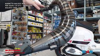 Questa marmitta MALOSSI POWER EXHAUST ad espansione è lo scarico racing da sostituire a quello originale (siluro, padellino o pignata) per i modelli Vespa Vespa 125 ET3 – 125 Primavera. Monta senza fare modifiche e le prestazioni migliorano a tutti i regimi di giri regalando ripresa e allungo (velocità). Negli ultimi anni molte sono le novità proposte dai vari brand che hanno segnato la storia della Vespa proponendo diverse versioni adatte a tutti i kit cilindro 125cc 130cc 135cc. Il prezzo di vendita varia dalla lavorazione, infatti alcune marmitte sono formate da due gusci stampati e saldati fra loro, altre hanno un insieme di coni e controconi (queste sono quelle con una linea più sportiva). Queste differenze di lavorazione modificano il costo della marmitta. Alcune marmitte montano un silenziatore esterno, rigenerabile con lana di vetro e modificabile, mentre altri hanno il silenziatore posizionato all'interno della pancia dello scarico. Si possono trovare modelli con DGM e omologazione stampata, ma per i modelli 50cc non esiste per l'Italia la versinone omologata.